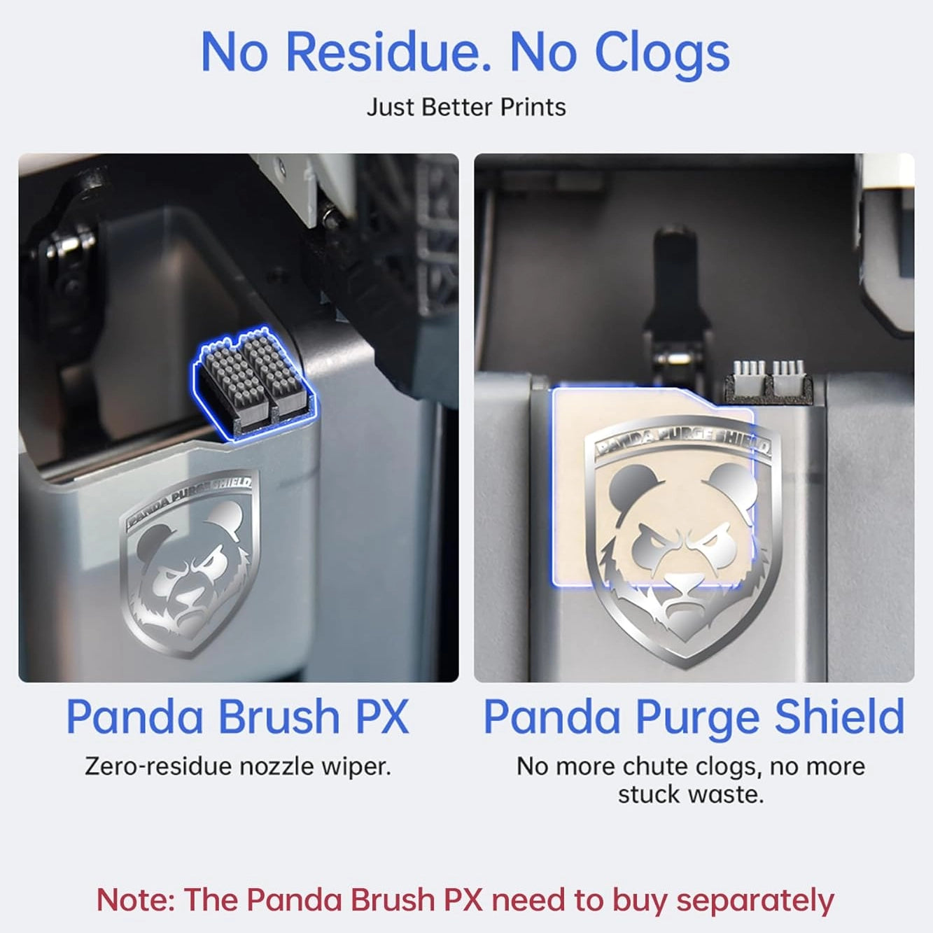 【Multi-Material Reliability Upgrades】BIQU provides you a solution of multi-material reliability upgrades that aims to help you get better prints without clogs and residue.The solusion includes the Panda Brush PX--a zero-residue nozzle wiper, and the Panda Purge shield- a nano polymer coating shield to avoid clogs and stuck poop (need to buy separately).