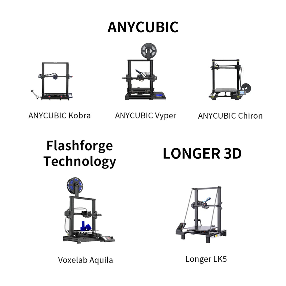 | Creality Ender 2, CR-6, Serie Ender 5, Serie CR10, Serie Ender 3 (Ender3, Ender3 PRO, Ender3V2, Ender 3 S1, Edner3MAX), ANYCUBIC Kobra, ANYCUBIC Vyper, ANYCUBIC Chiron, Voxelab Aquila, Neptune 2, Longer LK5 . |