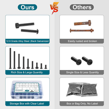 【Black Zinc Plated】These M3 screws and nuts are made of high quality 12.9 grade alloy steel, high strength, superior rust resistance and excellent oxidation resistance, with the feature of holding strong and lasting. The black galvanized finish M3 bolts are clean and not oily, have better rust-proof performance than other oiled screws.