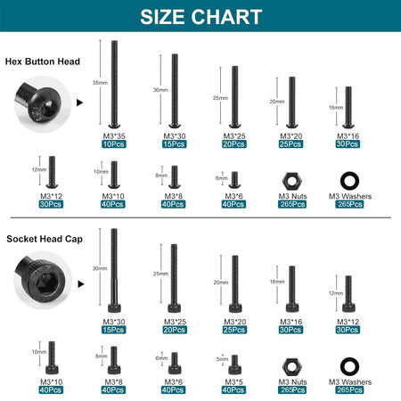 【Package Included】280pcs M3 x 5/6/8/10/12/16/20/25/30mm button head screws, 250pcs M3 x 6/8/10/12/16/20/25/30/35mm hex socket head cap screws, 530pcs M3 nuts and 530pcs flat washers, total 1590pcs, various sizes to meet all your daily needs.