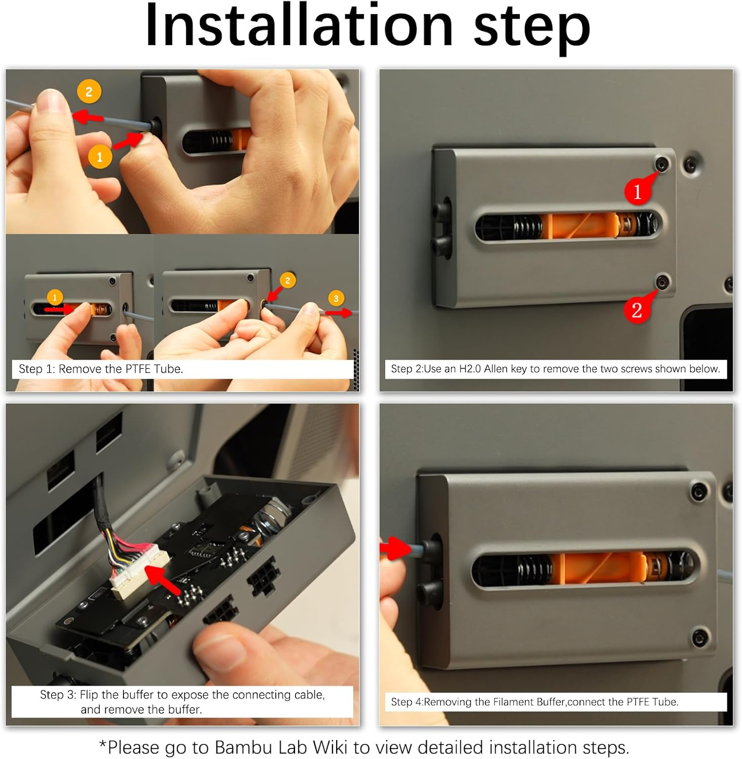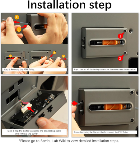 Simple Removal & Installation: Remove the existing buffer by unplugging the cable lock, removing two screws with an H2.0 Allen key, and disconnecting the PTFE tubing – then reverse the steps to install the new buffer